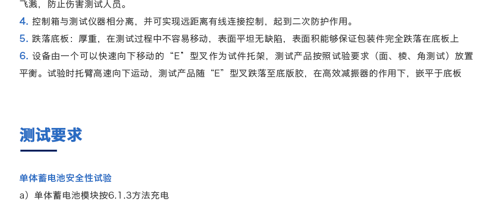 用途:動力電池跌落試驗機主要用于評估各類鋰電池及鎳電池等其他一次電池,二次電池,蓄電池單體或電池組自由跌落(例如從臺面頂部)的安全性能。電池以不爆炸不起火為合格。