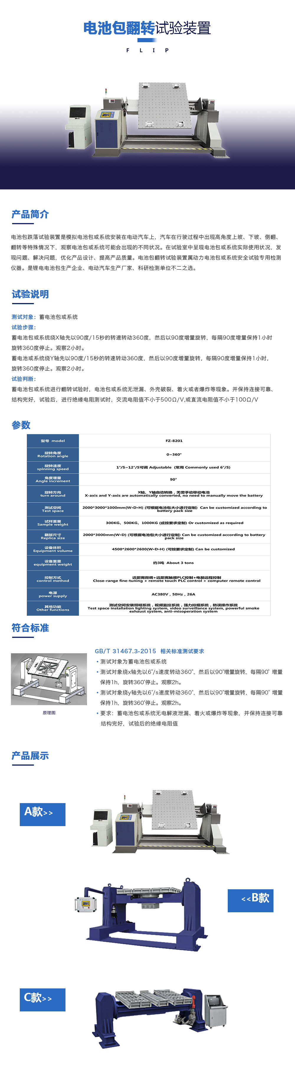 用途:電池包翻轉試驗臺是模擬電池包或系統安裝在電動汽車上,汽車在行駛過程中出現高角度上坡、下坡、側翻、翻轉等特殊情況下,觀察電池包或系統可能會出現的不同狀況。在試驗室中