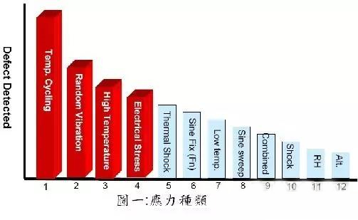 應(yīng)根據(jù)對(duì)產(chǎn)品篩選的效果選擇相應(yīng)的環(huán)境應(yīng)力。對(duì)電子產(chǎn)品,快速溫變?cè)囼?yàn)箱(ESS)的應(yīng)力主要選擇溫度(高、低溫)循環(huán)試驗(yàn)和振動(dòng)試驗(yàn),這兩種應(yīng)力的組合篩選效果較好,能暴露產(chǎn)品各組裝等級(jí)大部分故障。